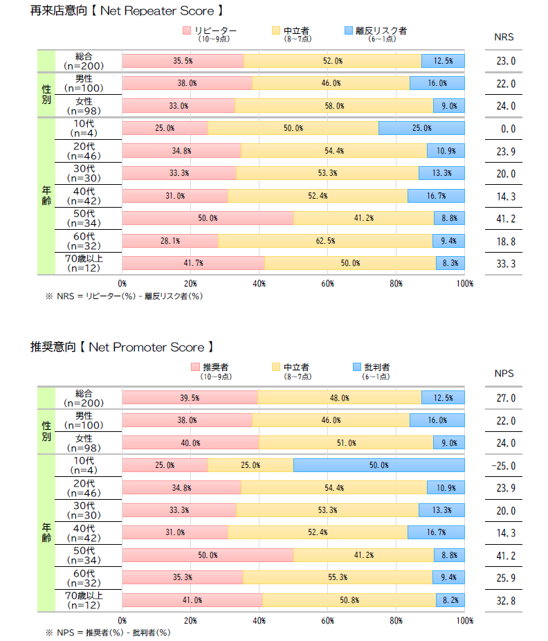 1~6点 批判者 不満があり、否定的な口コミをする可能性がある 7~8点 中立者 満足はしているが、強くはすすめない 9~10点 推奨者 非常に満足しており、他人にすすめる可能性が高い 是非、お店の成績表としてご活用ください。毎年、同じ時期にして頂くと経年比較としてもご利用頂けます。